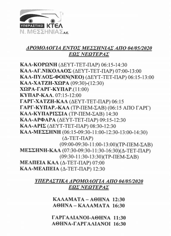 Ανακοίνωση εξέδωσε το Υπεραστικό ΚΤΕΛ Μεσσηνίας ότι τροποποιούνται από τη Δευτέρα 4 Μαΐου 2020 τα δρομολόγια του.