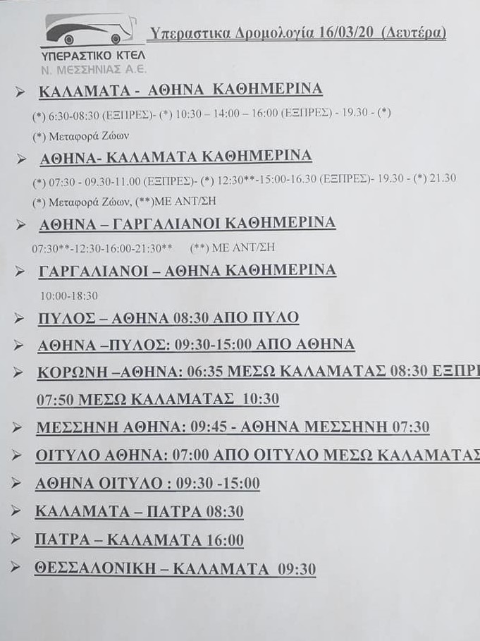 Ανακοίνωση εξέδωσε το Υπεραστικό ΚΤΕΛ Μεσσηνίας ότι τροποποιούνται από τη Δευτέρα 16 Μαρτίου 2020 τα δρομολόγια του.