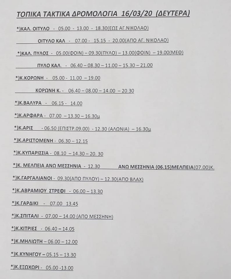Για τη Δευτέρα 16 Μαρτίου 2020 θα ισχύουν τα παρακάτω δρομολογία στο ΚΤΕΛ Μεσσηνίας: