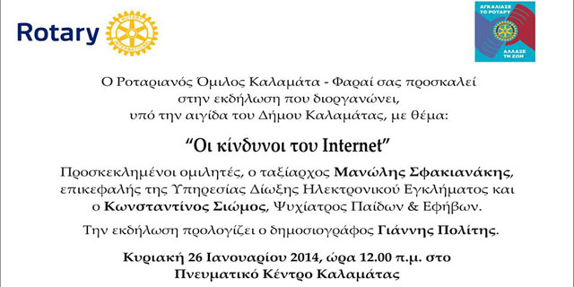 Ημερίδα για τους κινδύνους στο Διαδίκτυο πραγματοποιήθηκε την Κυριακή 26 Ιανουαρίου στο Πνευματικό Κέντρο Καλαμάτας, από τον Ροταριανό Όμιλο Καλαμάτα - Φαραί, με κεντρικούς ομιλητές τους ταξίαρχο Μανώλη Σφακιανάκη, Διευθυντή της Υπηρεσίας Δίωξης Ηλεκτρονικού εγκλήματος και Κωνσταντίνο Σιώμο, ψυχίατρο Παίδων και Εφήβων.