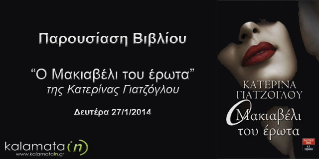 Παρουσίαση του βιβλίου "Ο Μακιαβέλι του έρωτα" της Κατερίνας Γιατζόγλου θα γίνει τη Δευτέρα 27 Ιανουαρίου στις 20:00 από το βιβλιοπωλείο "Λυμπερόπουλος" και τον Εκδοτικό Οργανισμό "Λιβάνη". Στην εκδήλωση, στην οποία θα παρευρεθεί και η συγγραφέας όπου θα συνομιλήσει με το κοινό, θα μιλήσει για το βιβλίο η Μυρτώ Καμβυσίδη και αποσπάσματα θα διαβάσει η Κλεοπάτρα Σερελέα. Η εκδήλωση θα πραγματοποιηθεί στο restaurant "fish & pasta kannas" (Ποσειδώνος 12, Μαρίνα Καλαμάτας).