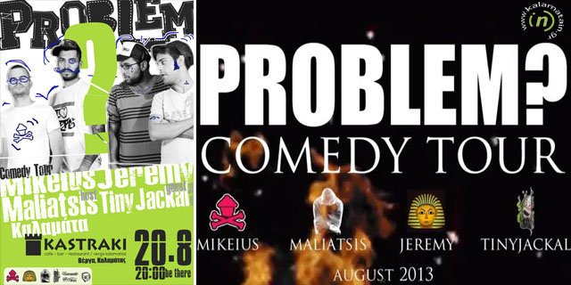 Την Καλαμάτα επέλεξαν ως έναν από τους σταθμούς της καλοκαιρινής τους περιοδείας τρεις κωμικοί από το comedy lab και ένας raper με στόχο να μας διασκεδάσουν με τις ατάκες και το ταλέντο τους στο stand up comedy. Το "PROBLEM? Comedy Tour" με τους Mikeius, Jeremy, Mαλιάτση και Tiny Jackal επισκέπτεται την Καλαμάτα και το "Καστράκι" την Τρίτη 20 Αυγούστου, στις 20:00.