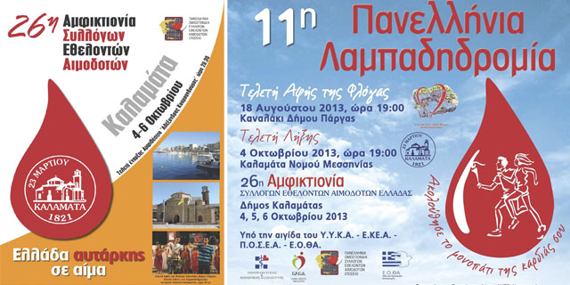 Στην Καλαμάτα θα πραγματοποιηθεί η 26η Αμφικτιονία από 4 έως 6 Οκτωβρίου 2013, με την τελετή έναρξης να πραγματοποιείται το βράδυ της ίδιας ημέρας στο Αμφιθέατρο «Αλέξανδρος Κουμουνδούρος» στις 20:30. Πριν από αυτό, στις 18:30, η Καλαμάτα θα υποδεχθεί τη φλόγα από την 11η λαμπαδηδρομία των εθελοντών αιμοδοτών, η οποία ύστερα από ταξίδι σε όλες τις νησιωτικές και χερσαίες περιοχές της χώρας μας, θα καταλήξει στην Κεντρική Πλατεία της πόλης μας.