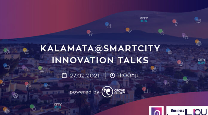 Το Σάββατο 27 Φεβρουαρίου 2021 και ώρα 11:00 θα πραγματοποιηθεί η υβριδική εκδήλωση, Kalamata@Smartcity Innovation Talks, η οποία αποτελεί την συνέχεια του επιτυχημένου City Innovation Talks, που πραγματοποιήθηκε τον Ιούλιο του 2020 στην Αθήνα από την Crowdpolicy, με τη συμμετοχή της Κεντρικής Ένωσης Δήμων Ελλάδας, της Περιφέρειας Αττικής και 30 Δημάρχων από όλη την χώρα, όπου παρουσίασαν καλές πρακτικές.