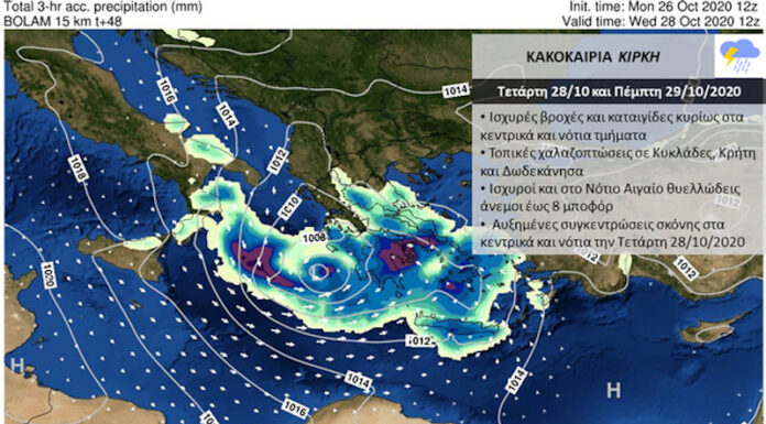 Ένα βαρομετρικό χαμηλό, το οποίο θα δημιουργηθεί τις πρωινές ώρες της Τρίτης στην Ιταλία, θα κινηθεί γρήγορα ανατολικά προς την Ελλάδα, σύμφωνα με τα τελευταία διαθέσιμα προγνωστικά στοιχεία του meteo του Εθνικού Αστεροσκοπείου Αθηνών. Από τις πρώτες πρωινές ώρες της Τετάρτης 28/10 έως τις βραδινές ώρες της Πέμπτης 29/10, θα προκαλέσει τη νέα κακοκαιρία Κίρκη, όπως "βαφτίστηκε" από το meteo.