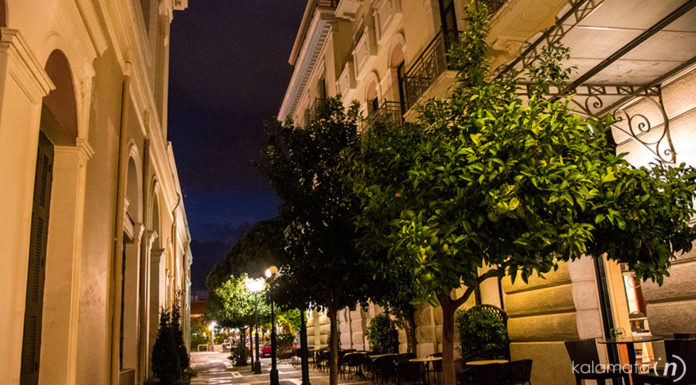 Σημείο της Κεντρικής Πλατείας Καλαμάτας (Βασιλέως Γεωργίου) το βράδυ.