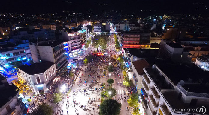 Εντυπωσιακή εναέρια άποψη της Κεντρικής Πλατείας Καλαμάτας το βράδυ με κόσμο.