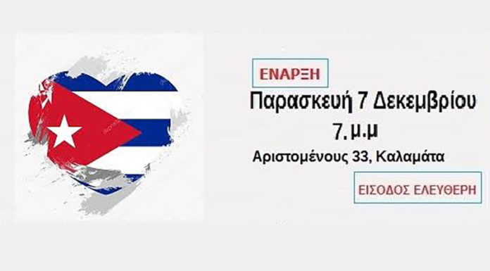 Ο Ελληνοκουβανικός Σύνδεσμος Καλαμάτας, για να τιμήσει τα 60 χρόνια της Κουβανικής Επανάστασης, διοργανώνει μαζί με την Πρεσβεία της Κούβας- Έκθεση φωτογραφίας - «ΜΕ ΤΗΝ ΚΟΥΒΑ ΣΤΗΝ ΚΑΡΔΙΑ» - στο Πνευματικό Κέντρο της Καλαμάτας, από την Παρασκευή 7 ως το βράδυ της Κυριακής 9 Δεκεμβρίου.