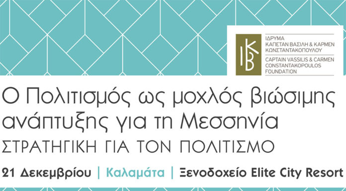 Το "Ίδρυμα Καπετάν Βασίλη & Κάρμεν Κωνσταντακόπουλου" ολοκληρώνει τις δράσεις του για το 2018 με μια ενημερωτική εκδήλωση με τίτλο "Ο πολιτισμός ως μοχλός βιώσιμης ανάπτυξης για τη Μεσσηνία", που διοργανώνεται την Παρασκευή 21 Δεκεμβρίου στις 17:00, στο Συνεδριακό χώρο του ξενοδοχείου Elite City Resort, στην Καλαμάτα, υπό την αιγίδα του Υπουργείου Εσωτερικών.