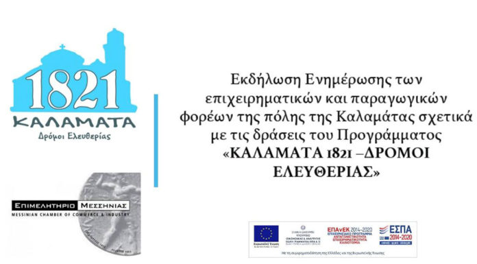 Εκδήλωση Ενημέρωσης των επιχειρηματικών & παραγωγικών φορέων της πόλης της Καλαμάτας καθώς και των Πολιτιστικών Συλλόγων σχετικά με τις δράσεις του Προγράμματος «ΚΑΛΑΜΑΤΑ 1821 – ΔΡΟΜΟΙ ΕΛΕΥΘΕΡΙΑΣ» θα πραγματοποιηθεί την Τετάρτη 31 Οκτωβρίου 2018 στις 19:00 στο Πανεπιστήμιο Πελοποννήσου.