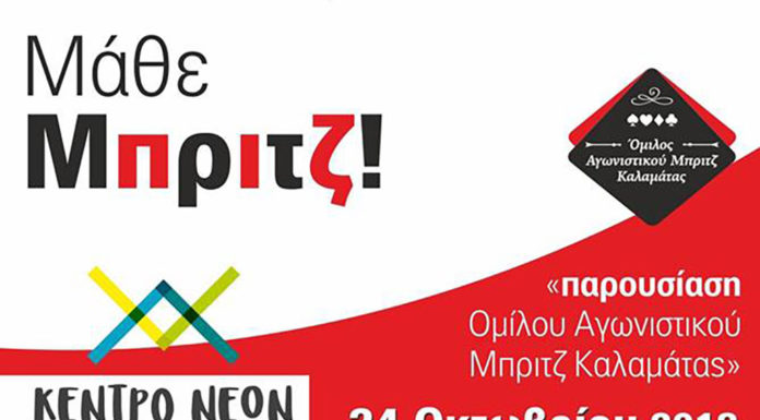 Την Τετάρτη 24 Οκτωβρίου στις 20:00, το Κέντρο Νέων Καλαμάτας φιλοξενεί τον Όμιλο Αγωνιστικού Μπριτζ Καλαμάτας για να μας κάνει μια εισαγωγή στα μυστικά του παιχνιδιού!