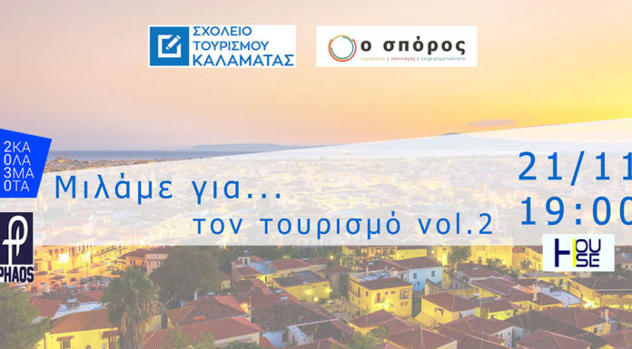 Το Σχολείο Τουρισμού Καλαμάτας και ο δίαυλος καινοτομίας «Ο Σπόρος» σε συνεργασία με την Κoινωνική Συνεταιριστική Επιχείρηση «Φάος» και την Κίνηση Πολιτών Καλαμάτα 2030, μάς προσκαλούν την Τετάρτη 21/11 και ώρα 19:00 στον πολυχώρο πολιτισμού House για να «μιλήσουμε για… τον τουρισμόvol.2».