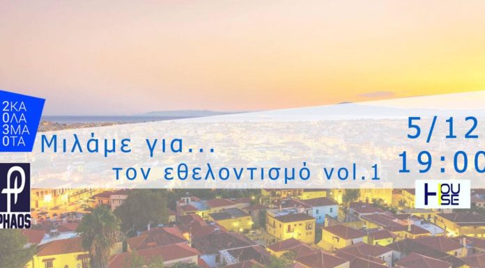 Η Κοινωνική Συνεταιριστική Επιχείρηση «Φάος» και η Κίνηση Πολιτών «Καλαμάτα 2030», διοργανώνουν την 3η κατά σειρά θεματική εκδήλωση «Μιλάμε για… τον Εθελοντισμό», την Τετάρτη 05/12/2018 και ώρα 19.00-20.00, στον πολυχώρο Επιχειρηματικότητας και Πολιτισμού “House by Phaos”, επί της οδού Σφακτηρίας 18 στην Καλαμάτα, με ελεύθερη είσοδο.
