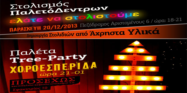 Οι Re:Think-project μας κάνουν μια πρωτότυπη και άκρως χριστουγεννιάτικη πρόταση! Μας καλούν να στολίσουμε, να δημιουργήσουμε και να διασκεδάσουμε, διακοσμώντας τα παλετοδεντρά μας με πρωτότυπα στολίδια χειροποίητα από Re:Think υλικά, στην αρχή του πεζόδρομου της Αριστομένους, την Παρασκευή 20 Δεκεμβρίου, από τις 6 μέχρι τις 9 το βράδυ.