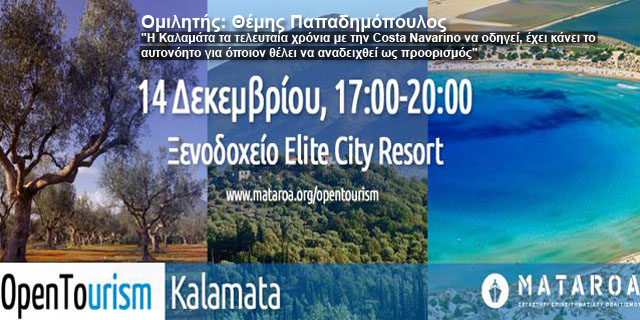 Το μη-κερδοσκοπικό εργαστήρι επιχειρηματικού πολιτισμού Mataroa, διοργανώνει για πρώτη φορά στην πόλη της Καλαμάτας το OpenTourism Kalamata, το Σάββατο, 14 Δεκεμβρίου, 17:00-20:00, στο ξενοδοχείο Elite City Resort.