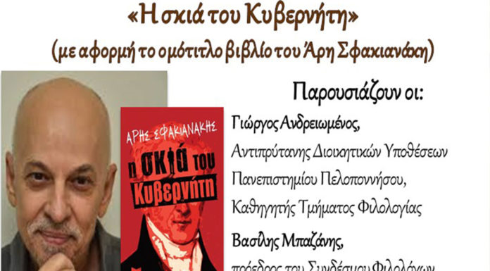 Στο πλαίσιο των δράσεων του Εργαστηρίου Διαχρονικής Μελέτης της Ελληνικής Γλώσσας και Γραμματείας «Νίκος Καρούζος», για το ακαδημαϊκό έτος 2019-2020, θα πραγματοποιηθεί εκδήλωση με τίτλο: Η σκιά του Κυβερνήτη (με αφορμή το ομότιτλο βιβλίο του Άρη Σφακιανάκη), την Τετάρτη, 11 Μαρτίου 2020, και ώρα 19:30.