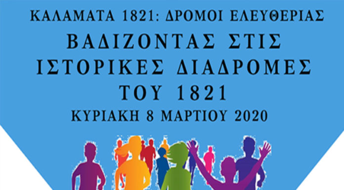 Το Πρόγραμμα "Καλαμάτα1821- Δρόμοι Ελευθερίας", με την υποστήριξη της Περιφέρειας Πελοποννήσου, του Δήμου Καλαμάτας και του Συλλόγου Ολυμπιονικών, θα πραγματοποιήσουν δυναμικό βάδισμα 8 χλμ. ενηλίκων, καθώς και τον περιπατητικό δρόμο 1,2 χλμ. αγοριών/κοριτσιών με την επωνυμία "Βαδίζοντας στις ιστορικές διαδρομές του 1821".
