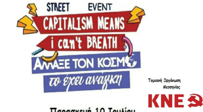 Μαθητικό street event με θέμα “Capitalism means I can’t breathe. Άλλαξε τον κόσμο το έχει ανάγκη!” διοργανώνει η Τομεακή Οργάνωση Μεσσηνίας της ΚΝΕ την Παρασκευή 10 Ιουλίου, στις 19:30 το απόγευμα, στην κεντρική πλατεία Καλαμάτας.