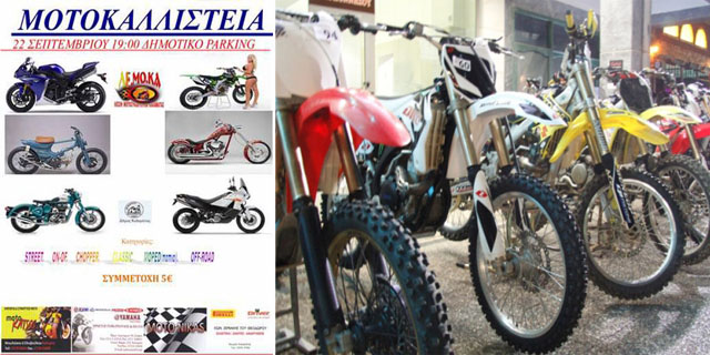 To αθλητικό σωματείο μοτοσικλετιστών Καλαμάτας ΛΕ.ΜΟ.ΚΑ, υπό την αιγίδα του Δήμου Καλαμάτας, διοργανώνει έναν πρωτότυπο διαγωνισμό για τους λάτρεις των δικύκλων! Την Κυριακή 22 Σεπτεμβρίου στις 7 το απόγευμα, στο Δημοτικό parking θα πραγματοποιηθεί για πρώτη φορά στην πόλη μας διαγωνισμός μοτοσικλετιστικού κάλλους!