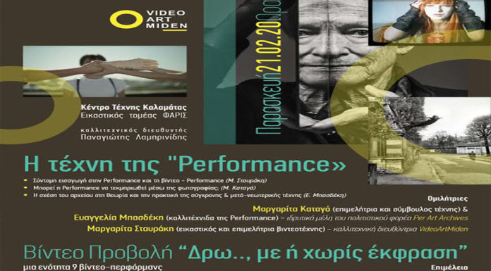 Προσωπικότητες της τέχνης διοργανώνουν ή θα συμμετέχουν την άλλη Παρασκευή σε μια εκδήλωση που σκοπό έχει να βοηθήσει το κοινό να διεισδύσει στην τέχνη της “Performance”. Είναι εκδήλωση με ομιλία και προβολή έργων βίντεο, από το Κέντρο Τέχνης Καλαμάτας και τον καλλιτεχνικό του διευθυντή, Παναγιώτη Λαμπρινίδη, με προσκεκλημένους το Video Art Μηδέν και τη Μαργαρίτα Σταυράκη και με κεντρικές καλεσμένες την Μαργαρίτα Καταγά και την Ευαγγελία Μπασδέκη…