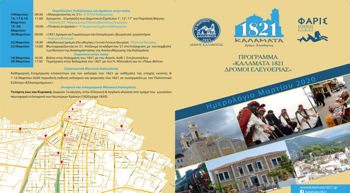 Στο πλαίσιο υλοποίησης του προγράμματος «ΚΑΛΑΜΑΤΑ 1821- Δρόμοι Ελευθερίας» ανακοινώθηκαν οι δράσεις του Δήμου Καλαμάτας για τις δράσεις του Μαρτίου 2020. Πρόκειται για ένα μήνα γεμάτο Δρώμενα, Αναπαραστάσεις, Μουσικές Εκδηλώσεις, Θέατρο, Παιχνίδια, Εικαστικά και Παραδοσιακές Γεύσεις.