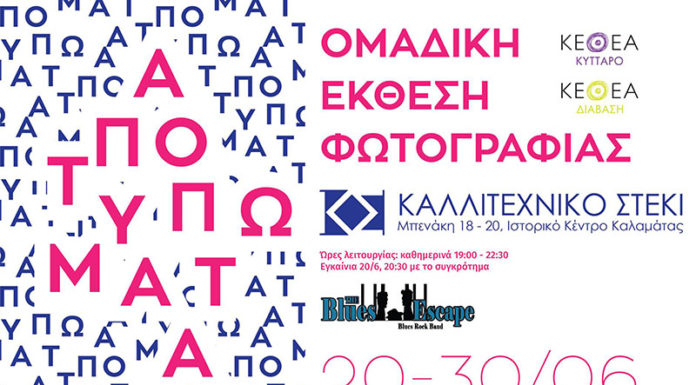 Τα εγκαίνια της ομαδικής έκθεσης φωτογραφίας με τον τίτλο «ΑΠΟΤΥΠΩΜΑΤΑ» θα πραγματοποιηθούν την Πέμπτη 20 Ιουνίου στις 20:30 στο Καλλιτεχνικό Στέκι (πεζόδρομος Μπενάκη, Ιστορικό Κέντρο Καλαμάτας). Η έκθεση θα διαρκέσει μέχρι τις 30 Ιουνίου και πραγματοποιείται με αφορμή την Παγκόσμια Ημέρα κατά των Ναρκωτικών (26 Ιουνίου).