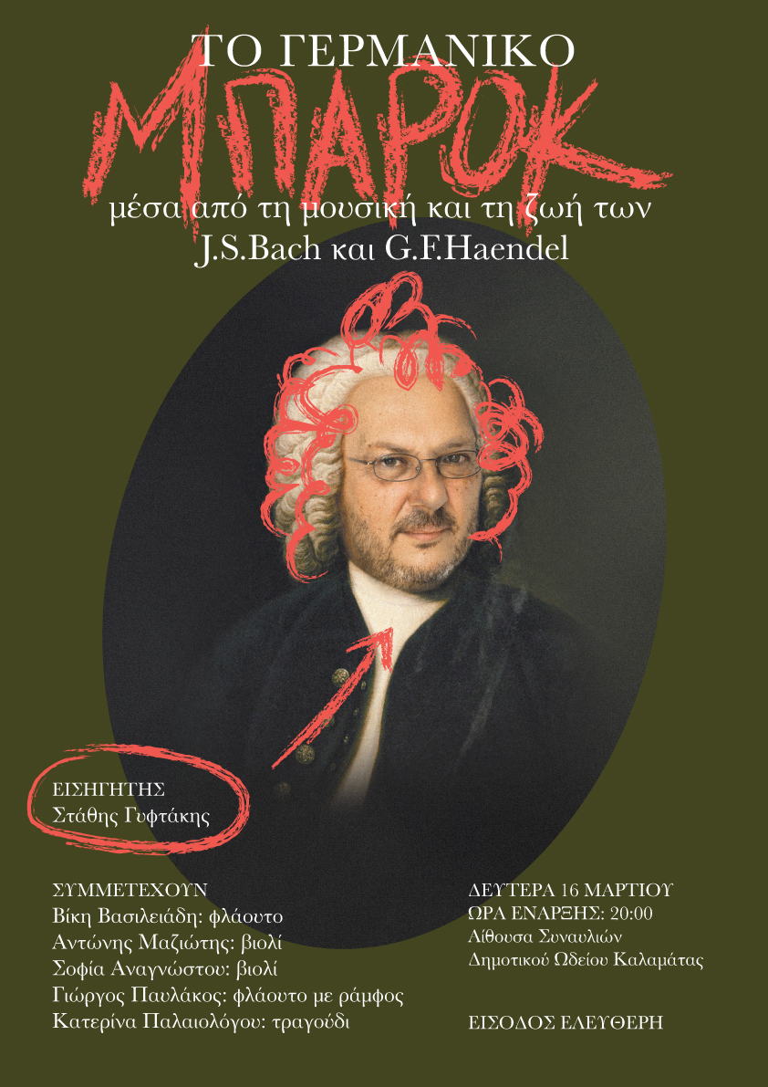 Την Δευτέρα 16 Μαρτίου 2026, στις 20:00, στην Αίθουσα συναυλιών του Δημοτικού Ωδείου Καλαμάτας θα πραγματοποιηθεί η τέταρτη κατά σειρά διάλεξη του Στάθη Γυφτάκη για την Ιστορία της Μουσικής. Θέμα της διάλεξης, η εποχή του Γερμανικού Μπαρόκ μέσα από την μουσική και την ζωή (κυρίως) των J.S.Bach και G.F.Haendel.