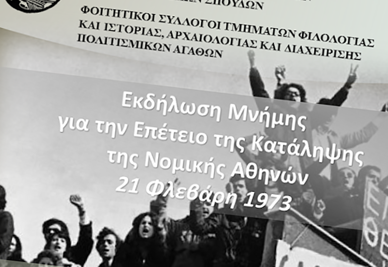 Οι Φοιτητικοί Σύλλογοι των Τμημάτων Φιλολογίας και Ιστορίας, Αρχαιολογίας και Διαχείρισης Πολιτισμικών Αγαθών του Πανεπιστημίου Πελοποννήσου, μάς προσκαλούν στην Εκδήλωση Μνήμης για την επέτειο της κατάληψης της Νομικής Αθηνών του 1973, την Πέμπτη 21 Φεβρουαρίου 2019 στις 19:00, στο Αμφιθέατρο «Νικόλαος Πολίτης» της Σχολής Ανθρωπιστικών Επιστημών και Πολιτισμικών Σπουδών της Καλαμάτας.