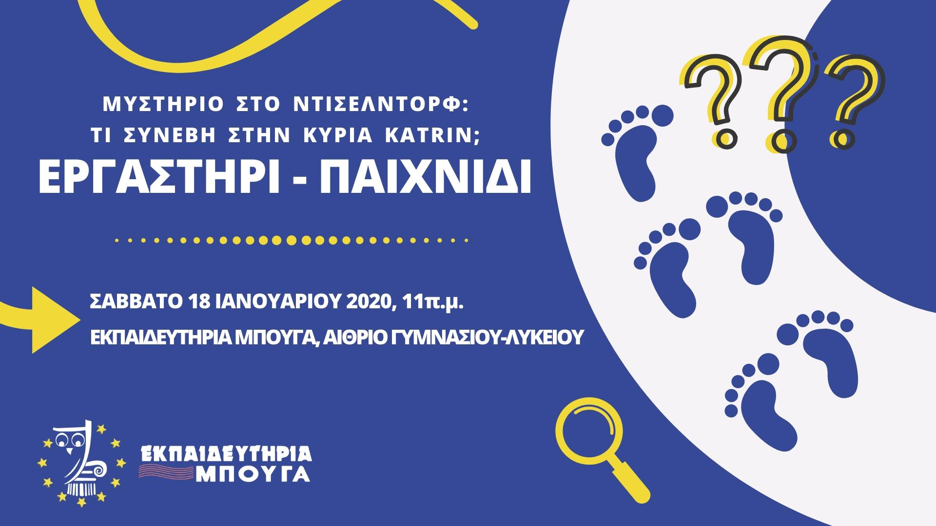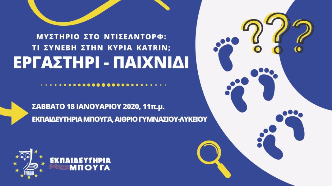 Το τμήμα Γερμανικών των Εκπαιδευτηρίων Μπουγά διοργανώνει το Σάββατο 18 Ιανουαρίου 2020 στις 11 π.μ στο Αίθριο του Γυμνασίου – Λυκείου ένα παιχνίδι μυστηρίου για μαθητές και μαθήτριες από 8 έως και 15 ετών.