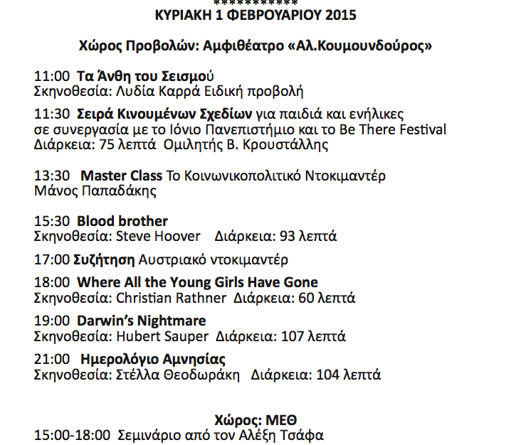 Το πρόγραμμα του 2015 περιλαμβάνει αφιερώματα αλλά και σεμινάρια που θα διεξαχθούν από ξένους διεθνώς προβεβλημένους σκηνοθέτες από την Αυστρία, τη Γαλλία και τις ΗΠΑ, με την συνδρομή της Αυστριακής Πρεσβείας και του Γαλλικού Ινστιτούτου.