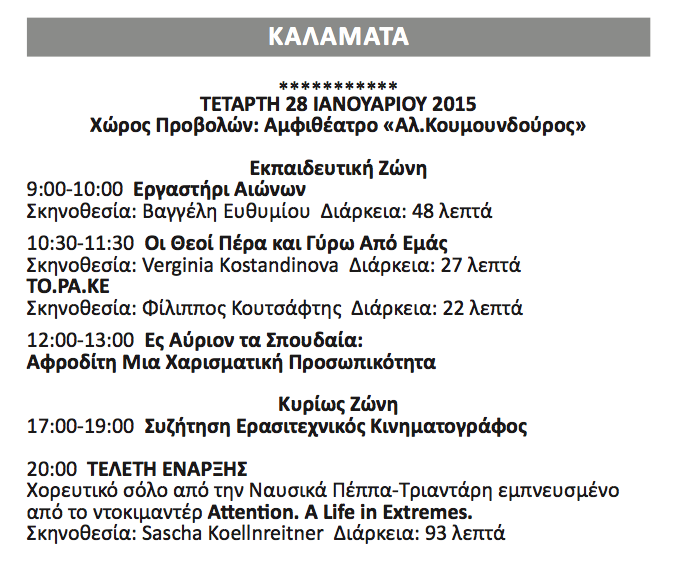 Ξεκίνησε σήμερα το Πρώτο Διεθνές Φεστιβάλ Ντοκιμαντέρ Πελοποννήσου! Θα διεξαχθεί από σήμερα 28 Ιανουαρίου εως 7 Φεβρουαρίου 2015 σε πέντε πόλεις: Καλαμάτα, Τρίπολη, Σπάρτη, Μεγαλόπολη, Αμαλιάδα.