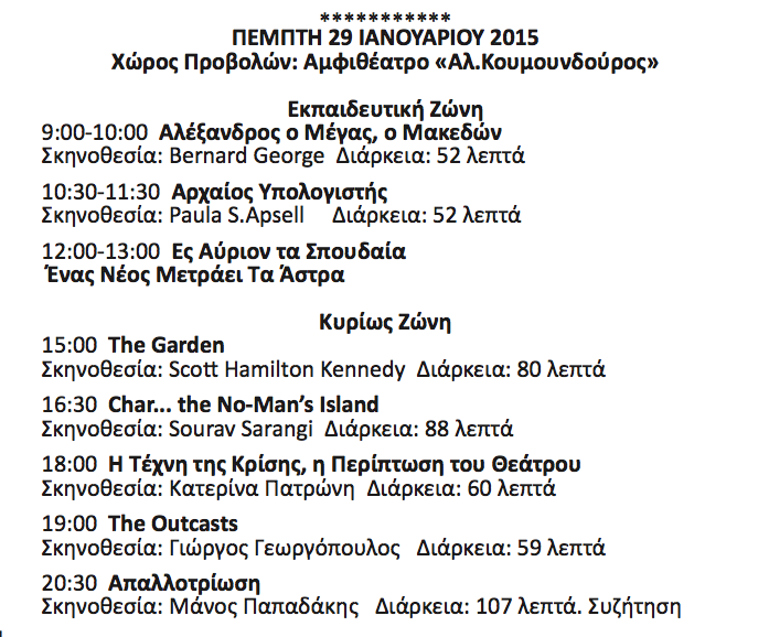 Το πρόγραμμα του 2015 περιλαμβάνει αφιερώματα αλλά και σεμινάρια που θα διεξαχθούν από ξένους διεθνώς προβεβλημένους σκηνοθέτες από την Αυστρία, τη Γαλλία και τις ΗΠΑ, με την συνδρομή της Αυστριακής Πρεσβείας και του Γαλλικού Ινστιτούτου.