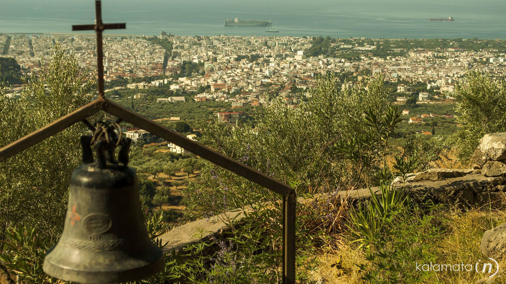 Η Καλαμάτα στο βάθος, μπροστά από ένα εκκλησάκι στο λόφο.