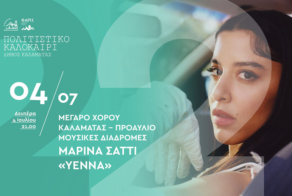 Τη Δευτέρα 4 Ιουλίου 2022 και ώρα 21.00, στο προαύλιο του Μεγάρου Χορού Καλαμάτας η τραγουδοποιός και πολυσχιδής καλλιτέχνης Μαρίνα Σάττι μας προσκαλεί σε μία ξεχωριστή και συναρπαστική μουσική εμπειρία!