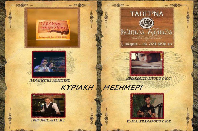 Αρχική Για το τι παίζει Κυριακή μεσημέρι στο Κάπως Αλλιώς Για το τι παίζει Κυριακή μεσημέρι στο Κάπως Αλλιώς Από "Kalamata IN" - 10 Δεκεμβρίου, 2017 Κυριακή μεσημέρι στο Κάπως Αλλιώς με ζωντανή μουσική, έντεχνα, λαϊκά και ρεμπέτικα. ΣΧΕΤΙΚΑ ΑΡΘΡΑΠΕΡΙΣΣΟΤΕΡΑ ΑΠΟ ΤΟ ΣΥΝΤΑΚΤΗ Για το τι παίζει Διήμερο περιηγήσεων με την ομάδα “Πάμε Βόλτα” Για το τι παίζει Πεζοπορία στην Αλαγονία οργανώνουν οι Περιηγητές Μεσσηνίας Για το τι παίζει Εξόρμηση στον Μυστρά προγραμματίζει ο Ορειβατικός Σύλλογος Καλαμάτας Για το τι παίζει 7o Διεθνές Φεστιβάλ Ντοκιμαντέρ Πελοποννήσου-Ανοιχτή πρόσκληση για συμμετοχές Για το τι παίζει Εξόρμηση στον Χελμό από τον ΣΠΟΚ Ευκλής Για το τι παίζει “O Καραγκιόζης στο βυθό”: Από το Θέατρο Σκιών Δημητρακόπουλου & την Πειραματική Σκηνή στο Κάστρο Καλαμάτας Για το τι παίζει Διαδικτυακή επιστημονική συζήτηση με θέμα «Πανδημία και Εκπαίδευση» Για το τι παίζει “Οι γυναίκες του 1915” από το Κέντρο Δημιουργικού Ντοκιμαντέρ Για το τι παίζει Shockwave κάθε Παρασκευή στο Route! Για το τι παίζει Μουσικές Συναντήσεις στο Elysian Luxury Hotel & Spa με τους “Σείριος” Για το τι παίζει Ζωντανή Μουσική κάθε Τρίτη – Πέμπτη & Σάββατο στο εστιατόριο “Ναυτίλος” cinema ΜΑΝΤΕΨΕ ΠΟΙΟΣ ΗΡΘΕ ΓΙΑ ΤΑ ΓΕΝΕΘΛΙΑ ΣΟΥ; (HAPPY BIRTHDAY)