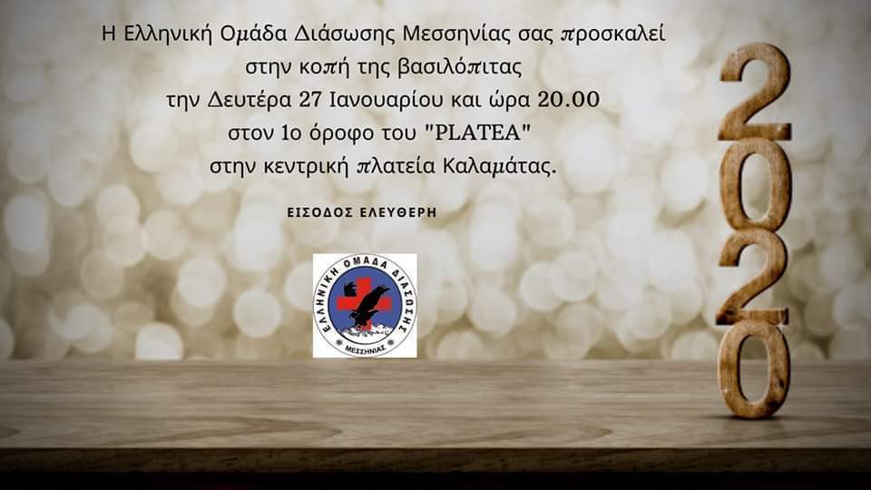 Η Ελληνική Ομάδα Διάσωσης Μεσσηνίας θα κόψει τη βασιλόπιτά της τη Δευτέρα 27 Ιανουαρίου 2020 στις 20:00, στον 1ο όροφο του “PLATEA”,στην κεντρική πλατεία Καλαμάτας.