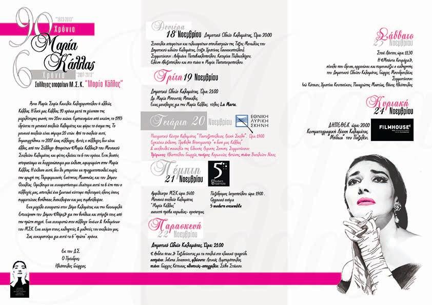 - Παρασκευή 15 Νοεμβρίου 2013, ώρα: 19.00: Εγκαίνια έκθεσης στο Πνευματικό κέντρο Μελιγαλά. Προβολή Ντοκιμαντέρ «η δική μας Κάλλας».