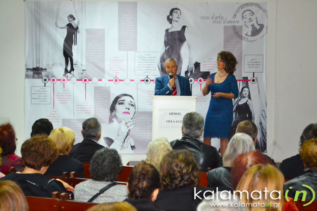 Τα εγκαίνια ξεκίνησαν με ένα σύντομο χαιρετισμό από την αντιδήμαρχο του Δήμου Οιχαλίας κα. Π. Γεωργακοπούλου, η οποία μίλησε για την καταγωγή και τη διαδρομή της μεγάλης Σοπράνο. Έπειτα, το λόγο πήρε ο Δήμαρχος Οιχαλίας κος Φίλιππος Μπάμης, ο οποίος ευχαρίστησε τόσο την Περιφερειακή Ενότητα Μεσσηνίας για τη συνεργασία, όσο και τον Σύλλογο Αποφοίτων “Μαρία Κάλλας” του Μουσικού Σχολείου Καλαμάτας για την πρωτοβουλία και την επιμέλεια του ντοκιμαντέρ “η δική μας Κάλλας” που προβλήθηκε για πρώτη φορά στα εγκαίνια στον Μελιγαλά.