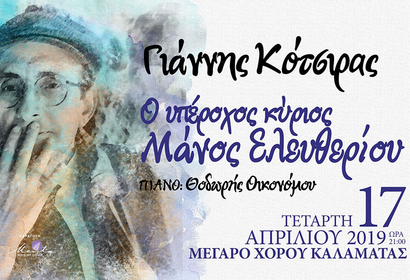 Ένα ιδιαίτερο ρεσιτάλ για πιάνο και φωνή με επίκεντρο τα τραγούδια του Μάνου Ελευθερίου, που «έφυγε» από κοντά μας το καλοκαίρι που μας πέρασε, παρουσιάζεται την Τετάρτη 17 Απριλίου 2019 στις 21:00 στο Μέγαρο Χορού Καλαμάτας.