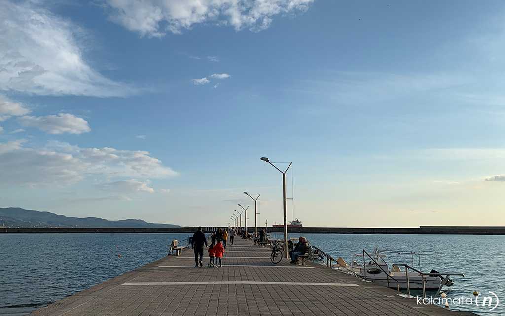 Ο μόλος στο Λιμάνι Καλαμάτας είναι η αγαπημένη βόλτα και των ντόπιων κι έτσι δεν υπάρχει περίπτωση να μην συναντήσετε εκεί παρέες όλων των ηλικιών να περπατούν, ειδικά τα γαλήνια απογεύματα με τον καλό καιρό, που n θάλασσα είναι “λάδι” και ο ήλιος σβήνει μακριά στον ορίζοντα.