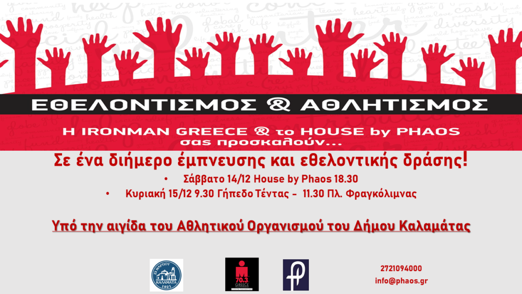 Με αφορμή τη διεθνή ημέρα εθελοντισμού η IRONMAN® 70.3® Greece και η “Φάος” Κοιν.Σ.Επ., υπό την αιγίδα του Αθλητικού Οργανισμού του Δήμου Καλαμάτας, διοργανώνουν το Σάββατο 14 Δεκεμβρίου και την Κυριακή 15 Δεκεμβρίου ένα διήμερο εθελοντισμού!