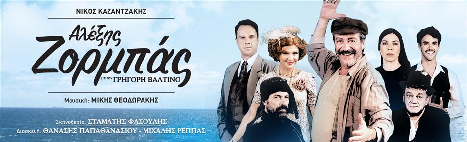 Αλέξης Ζορμπάς του Νίκου Καζαντζάκη: «Ο Ζορμπάς μ΄ έμαθε ν’ αγαπώ τη ζωή και να μη φοβούμαι το θάνατο…». Μουσική: Μίκης Θεοδωράκης. Σκηνοθεσία: Σταμάτης Φασουλής. Διασκευή: Θανάσης Παπαθανασίου & Μιχάλης Ρέππας. Στο ρόλο του Αλέξη Ζορμπά ο Γρηγόρης Βαλτινός