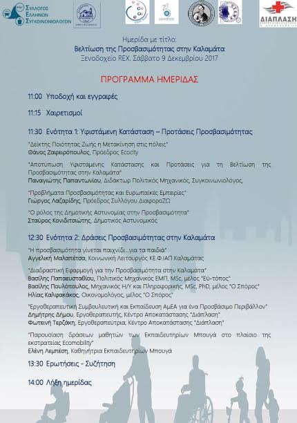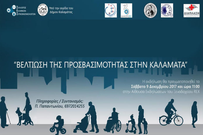 Ο Σύλλογος Ελλήνων Συγκοινωνιολόγων σε συνεργασία με το Κέντρο Φυσικής Ιατρικής και Αποκατάστασης (ΚΕΦΙΑΠ) Καλαμάτας και τον Αθλητικό Σύλλογο ΑμεΑ «ΔιαφοροΖΩ» διοργανώνουν ημερίδα υπό την αιγίδα του Δήμου Καλαμάτας με τίτλο «Βελτίωση της Προσβασιμότητας στην Καλαμάτα».